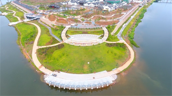 長(zhǎng)沙圩鎮(zhèn)碧道鋪設(shè)了瀝青并劃分跑道和自行車道,“顏值”再獲提升。(林翔?攝)位于梅江河圩鎮(zhèn)段碧道沿線的紅色休閑廣場(chǎng)效果....